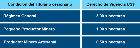 Para calcular el monto que corresponde a pagar por Derecho de Vigencia, se debe tener en cuenta la condición del titular o cesionario al momento del pago y la extensión del derecho minero, de acuerdo al siguiente cuadro: