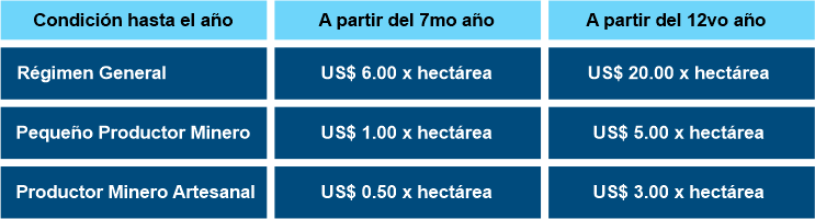 * Para las concesiones mineras vigentes al 10/10/2008, el pago de la Penalidad se realiza a partir del primer semestre del séptimo año, computado desde el año siguiente de otorgado el título, incrementándose a partir del duodécimo año. En el año 2019, el pago por la Penalidad se realiza de acuerdo a los montos establecidos por el Decreto Legislativo Nº 1320.