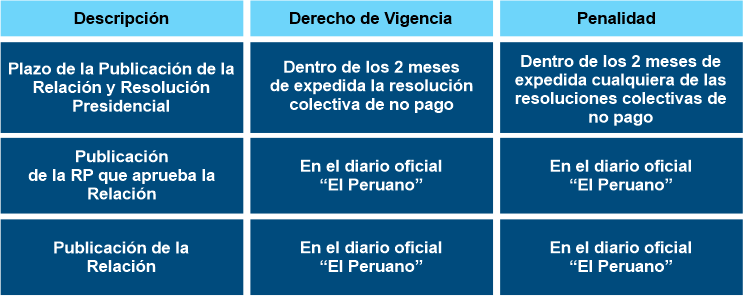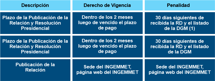 Si el titular no cumple con cancelar 1 (un) año el Derecho de Vigencia y/o Penalidad, el derecho minero mantiene su vigencia. El INGEMMET lo incluye en la relación de derechos mineros cuyos titulares o cesionarios no cumplieron con el pago oportuno del Derecho de Vigencia y/o Penalidad. La Resolución Presidencial que aprueba dicha relación es publicada en el Diario Oficial “El Peruano”, en los plazos y en la forma indicada en el siguiente Cuadro: