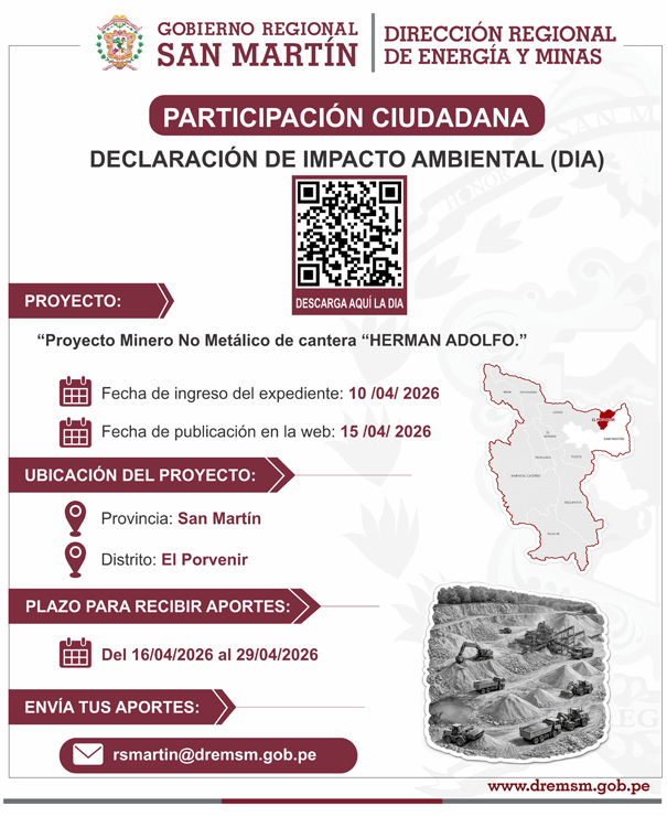 La Dirección Regional de Energía y Minas San Martín, es responsable de la implementación y ejecución de la política sectorial en el ambito regional, en materia de desarrollo sostenible de las actividades minero-energéticas. Asimismo, es la responsable de ejecutar, orientar, supervisar y evaluar las acciones que en materia sectorial le corresponde asumir, de acuerdo a las funciones transferidas por el Ministerio de Energía y Minas.